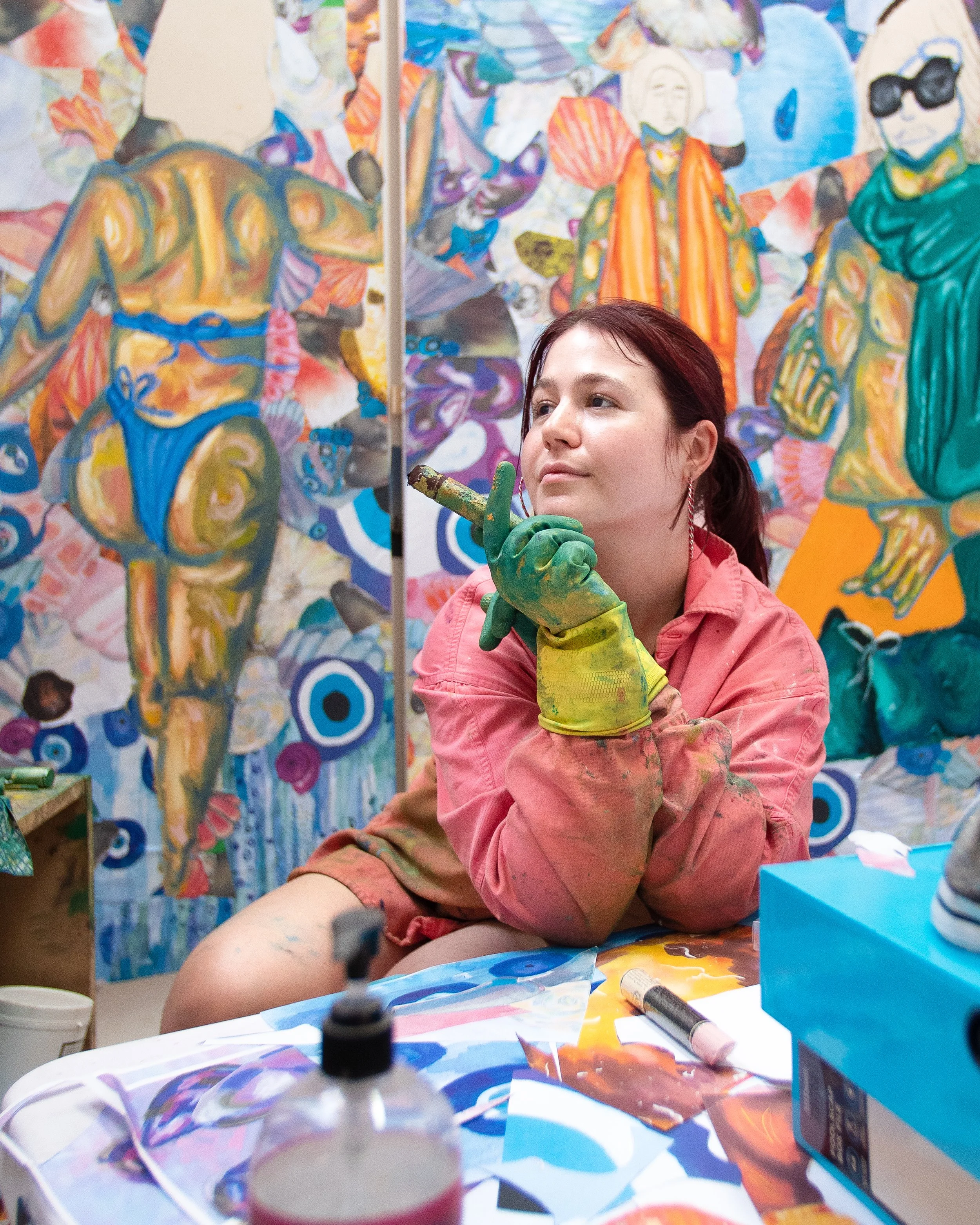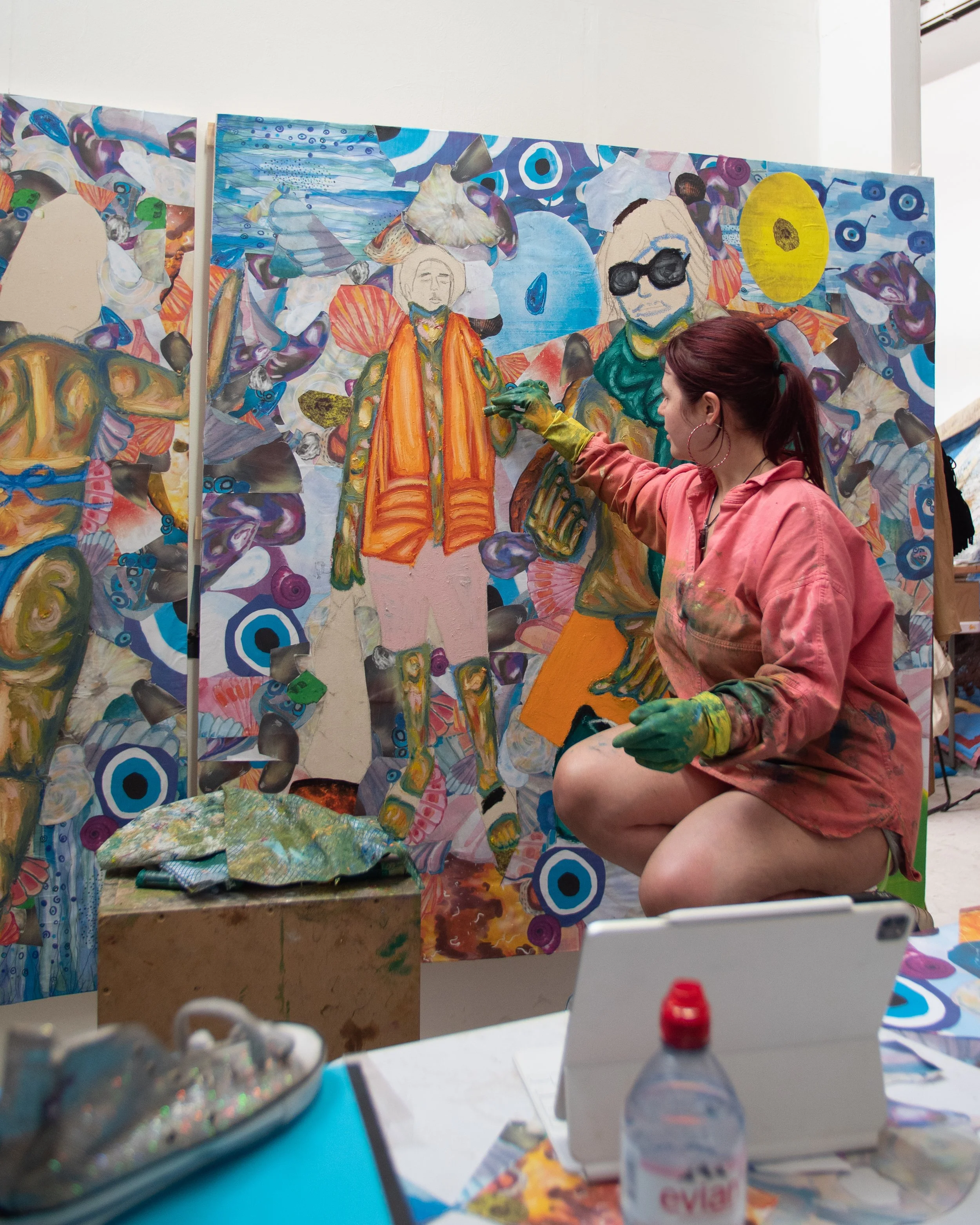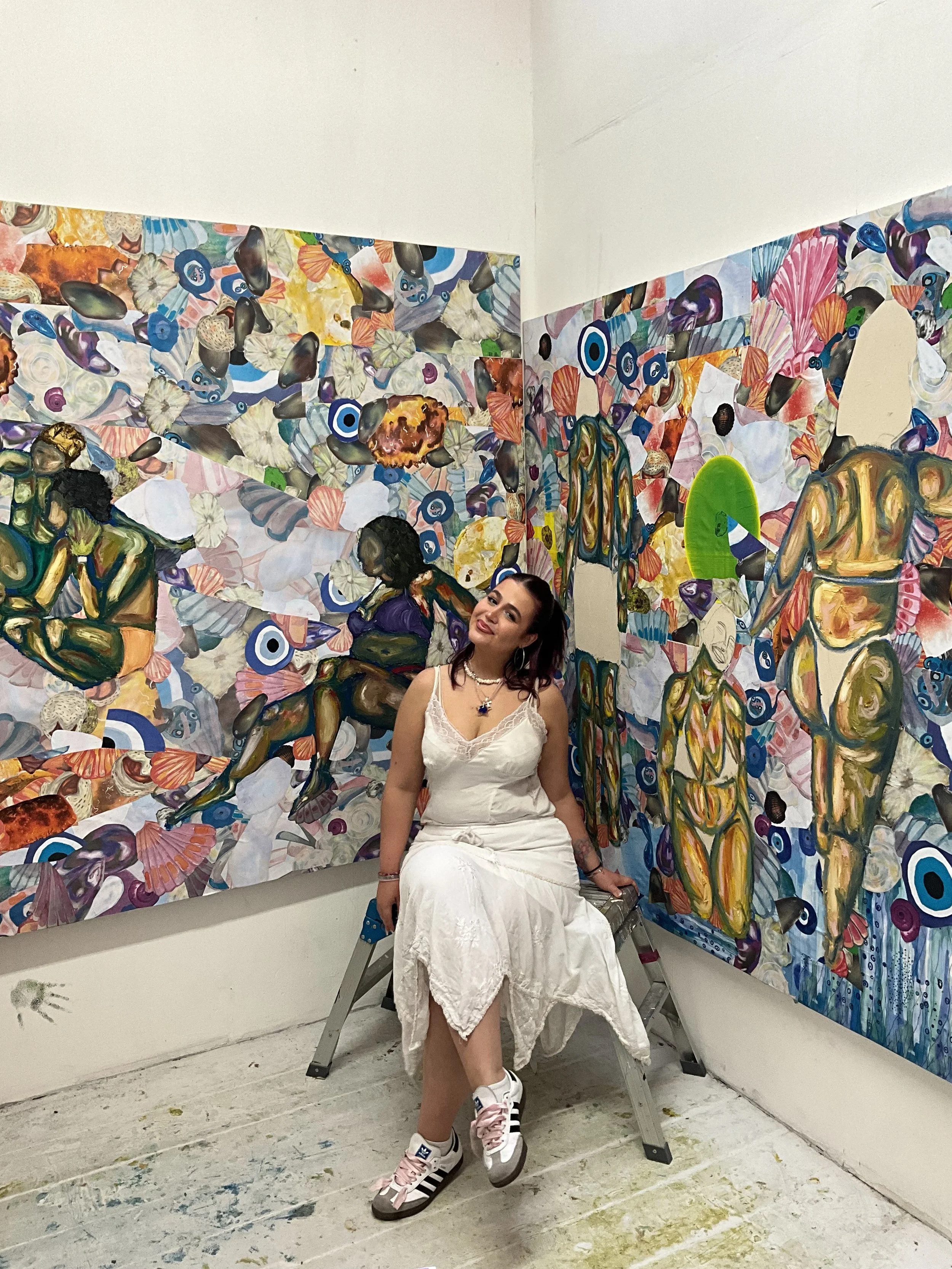 n the last two years, I've felt the effects of homesickness more than ever as London became less new and exciting, and the reality of my surroundings set in. To maintain my connection to home and my culture, I turned to my art. I began by revisiting pictures depicting my favorite landscapes, people, and places, understanding why they were dear to me. Ocean imagery, motives/situations, and the evil eye symbol emerged as constant themes. I experimented with various mediums including photography, makeup, oil pastel, and watercolor, eventually incorporating collage. Still life snapshots of island life from a young adult's perspective became central, inspired by 1960s French cinema depicting teenage years. This led to the creation of the first piece in my series, using collages backgrounds of prints representing cultural and visual representations of my home, in collaboration with Oil Stick figures on large-scale canvas.