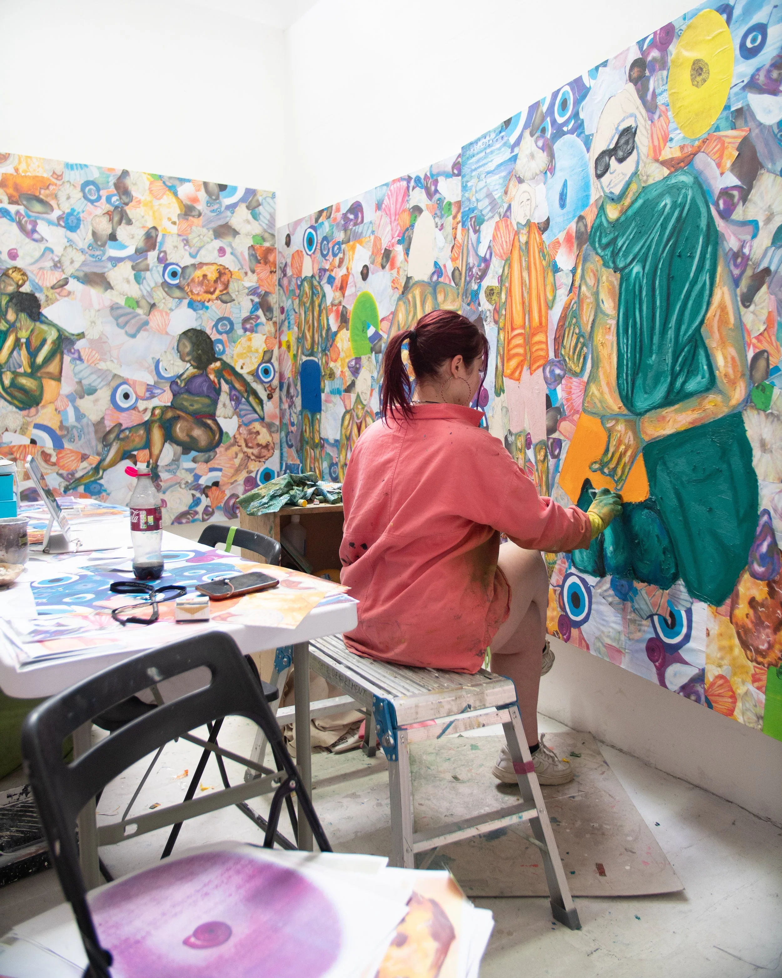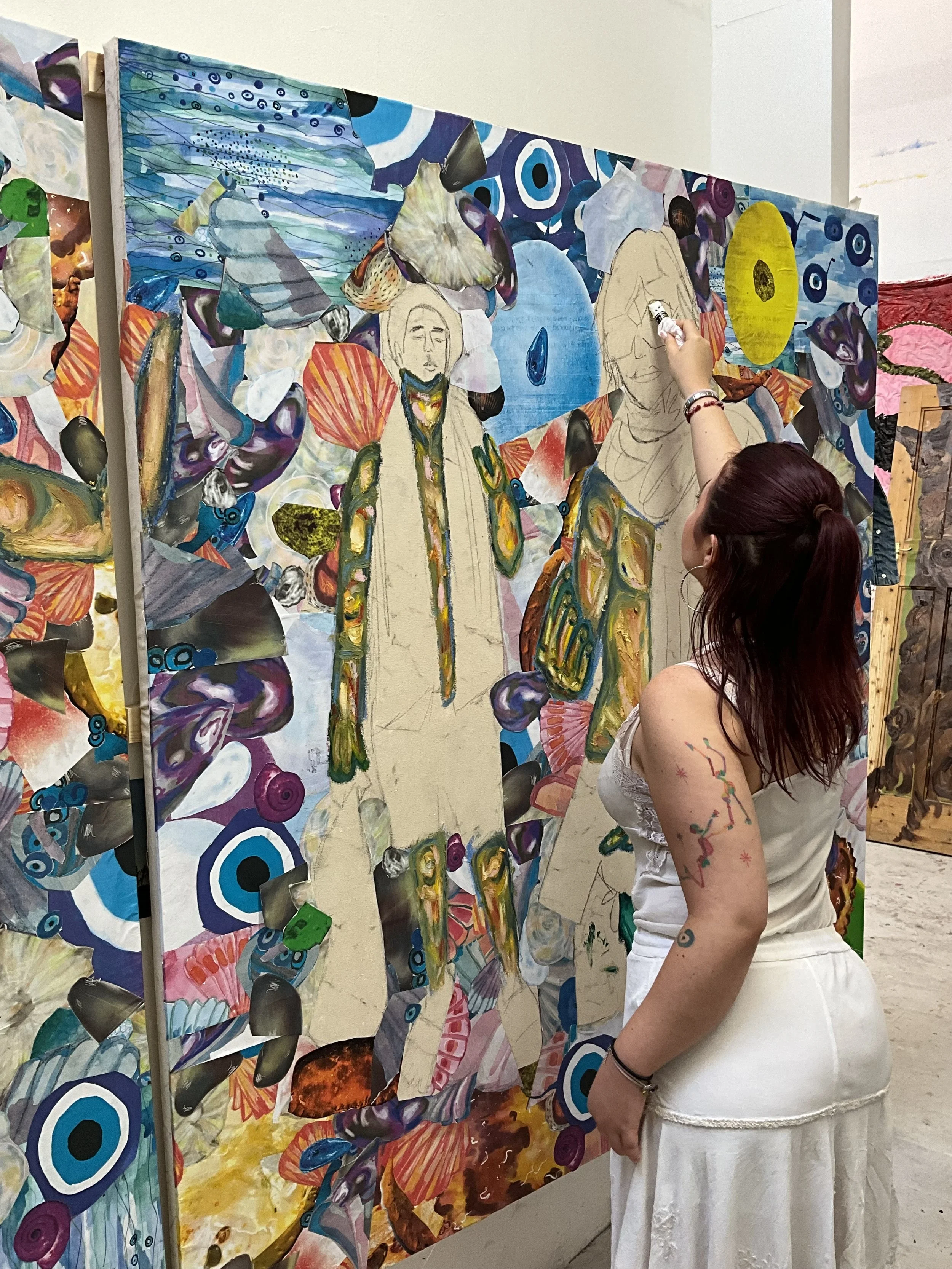 This marked an enlightening moment in my artistic career, as I felt I had truly found my style. It represented not only my home but also my personal experience of it – a loud, maximalistic, and colorful exploration. My studio work continues to focus on this theme and evolve this series. I've recently begun incorporating natural forms from Cyprus, such as shells, and expanding my range of media to include digital drawings and edited photography. I'm also exploring the mythological aspects of Cyprus alongside its landscapes and ruins, depicting abstract motifs while working directly from still moment photography snapshots from home. Currently, I'm working on my fourth Oil Stick and Collage on canvas large-scale piece in this series, with plans to create many more additions. Scale is crucial to my artistic process, as I aim to create an immersive experience for viewers, transporting them into my world and experience.